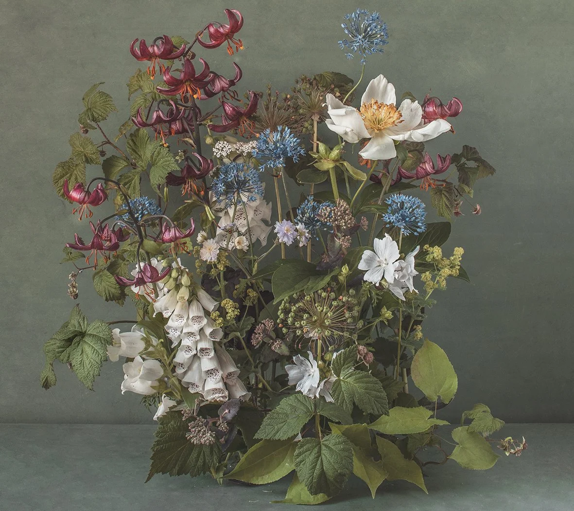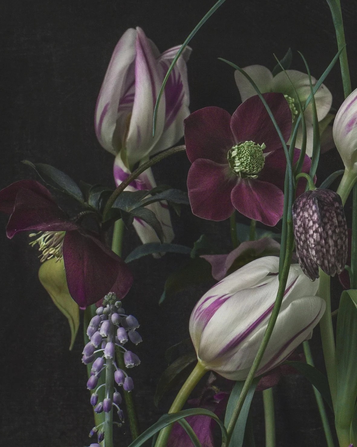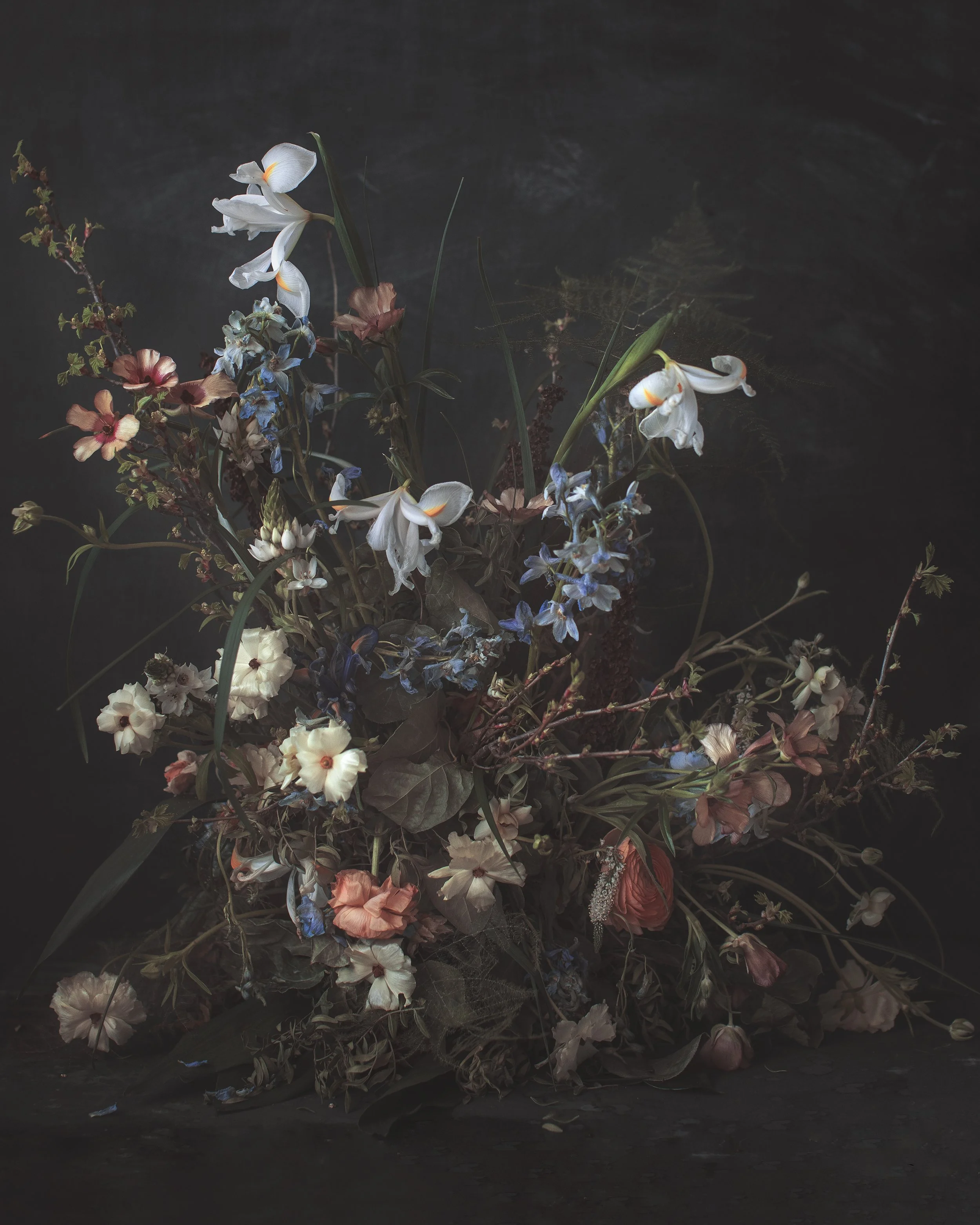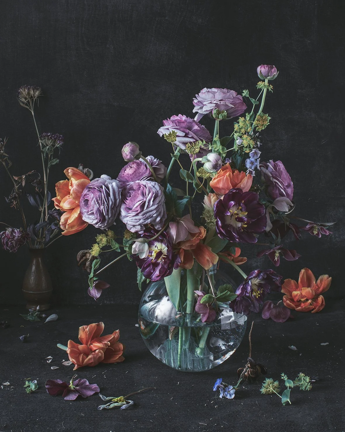 My inspiration comes from Dutch Golden Age painters and their use of light. I am also very fascinated about surreal and in my work I try always go beyond normal and real. Time is also interesting point of view. When you take a photo time stops. You can’t see what happened before and you can only imagine what happens next. It is very unnatural to have these still moments. In nature nothing ever stops, nature is all about the movement and change. Flowers change like us, they get old. Only we people want to stop time because time is fleeting from us and it takes away so many things even though it gives too. But we are vain. When I’m working I’m having a dialog with my flowers. Maybe about the bigger questions that bothers me or just vain thoughts of daily life. I combine fresh, wilting and dried flowers. I want to respect the whole life circle of the flower. Imperfection is very fascinating.